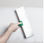 Держа шпатель параллельно поверхности, начинаем разгонять шпатлёвку под лентой от середины к краям. Тем самым мы клеим ленту, удаляем излишки клеевого слоя из-под неё и выравниваем поверхность в плоскость.