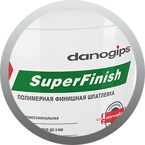 Название продукта SuperFinish. Над зеленой линией бренд Danogips |