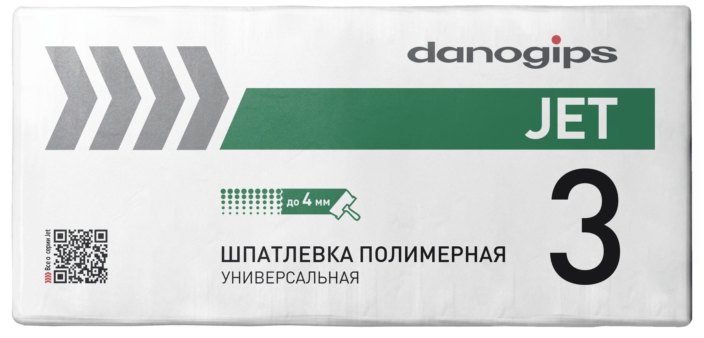 Danogips JET 3 (Даногипс Джет 3) – это сухая выравнивающая (универсальная) полимерная шпатлевка с возможностью нанесения слоя до 4 мм без появления усадочных трещин. Жизнеспособность раствора не менее 72 часов.