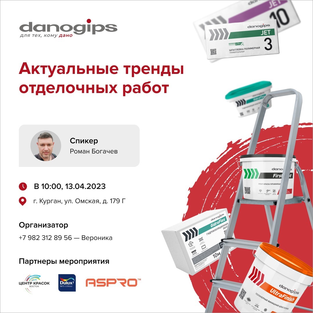 2023 yil 13 aprelda kurgan sherigi bilan birgalikda danogips va ASPRO seminarini o'tkazadi Dulux rang ustaxonasi Gogolin Leonid va G. kurgan ustalari jamoasi ko'magida.