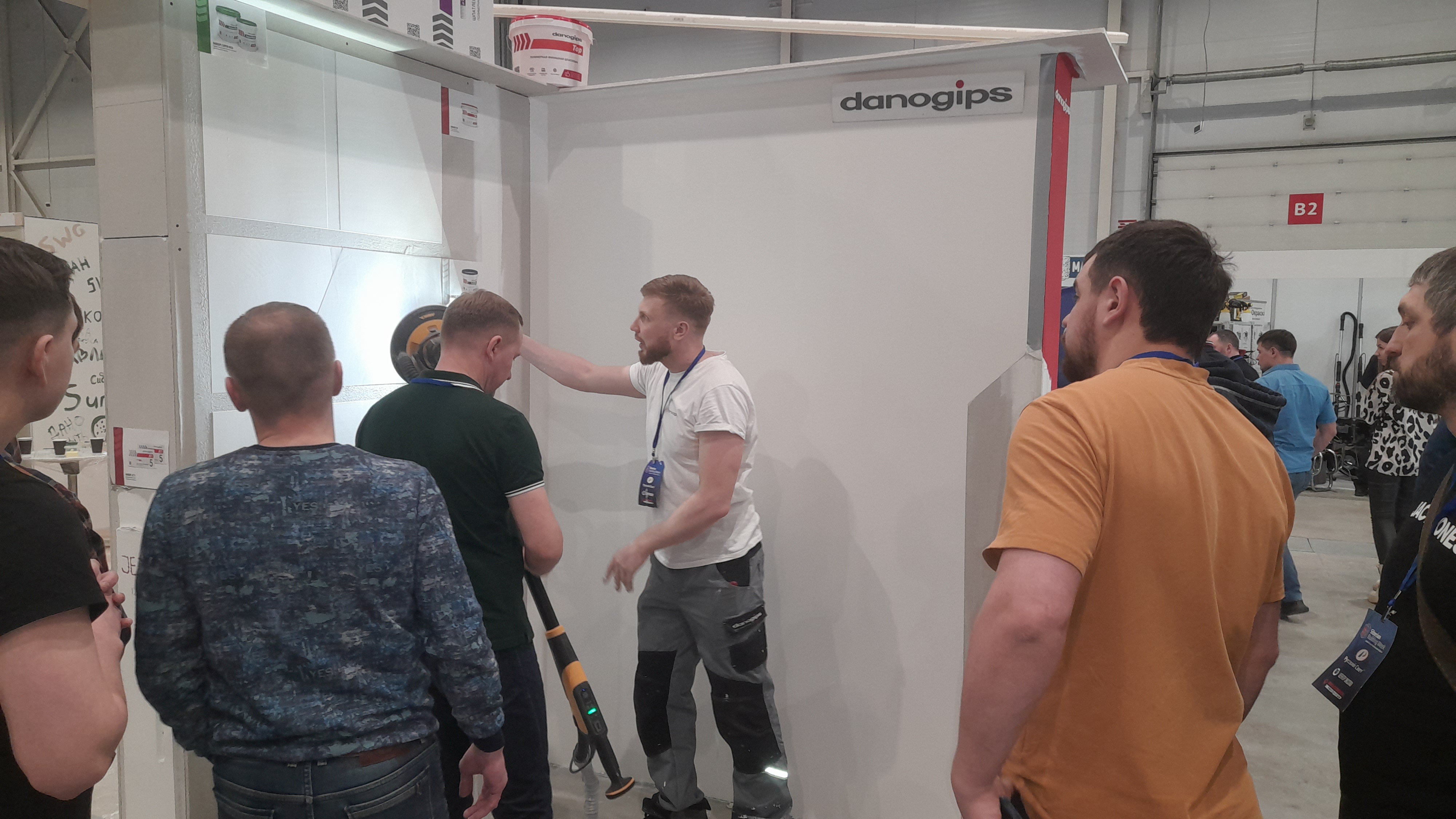 Danogips stendida hunarmandlar va kompaniya mutaxassislari bo'yoq ishlariga tayyorgarlik ko'rishda tez-tez uchraydigan xatolarni muhokama qildilar, danogips mahsulotlarini sinovdan o'tkazdilar, quruq va tayyor kompozitsiyalar o'rtasidagi sifat va farqni baholadilar. Ko'rgazmada ishtirok etish uchun Novosibirskga Bosh texnolog Kirill legin keldi va yangi mahsulotlarni taqdim etdi – Jet 3 va Jet 10 quruq macunlari, firstcoat tuproq bo'yoqlari, gidroizolyatsiya va GidroFlex gidroizolyatsiya lentasi.